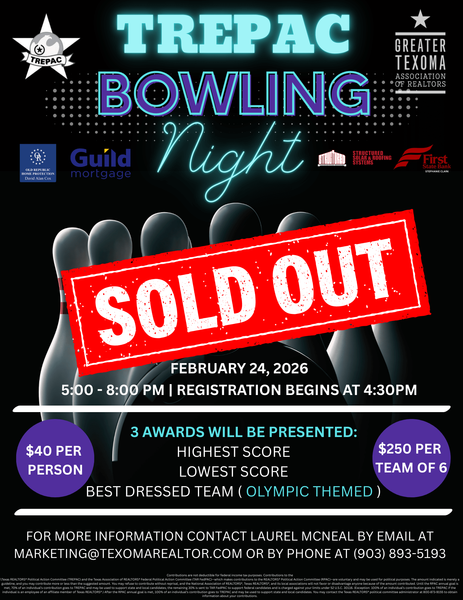 Get ready to roll for a great cause at our Annual TREPAC Bowling Tournament! Join fellow REALTORS®, Affiliates, and community partners for a fun-filled day of friendly competition, prizes, and plenty of laughs — all while supporting TREPAC and its mission to protect private property rights and the real estate industry. Form your team, show off your bowling skills (or lack thereof 😉), and come enjoy food, drinks, and good company!