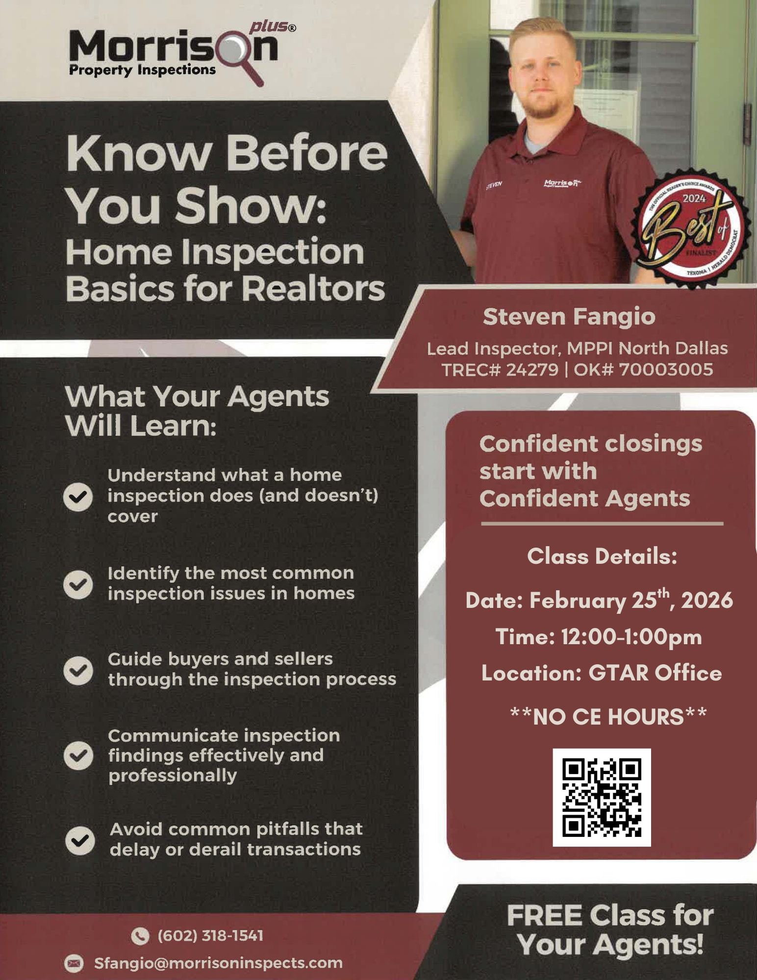 Join us for an Affiliate Exclusive Class: Know Before You Show with Morrison Plus Property Inspections! This session is designed to equip you with valuable knowledge and insights before stepping into your next showing. While no CE credit will be provided, this will be a highly informative and practical class you won’t want to miss. Lunch will be provided. We hope to see you there!